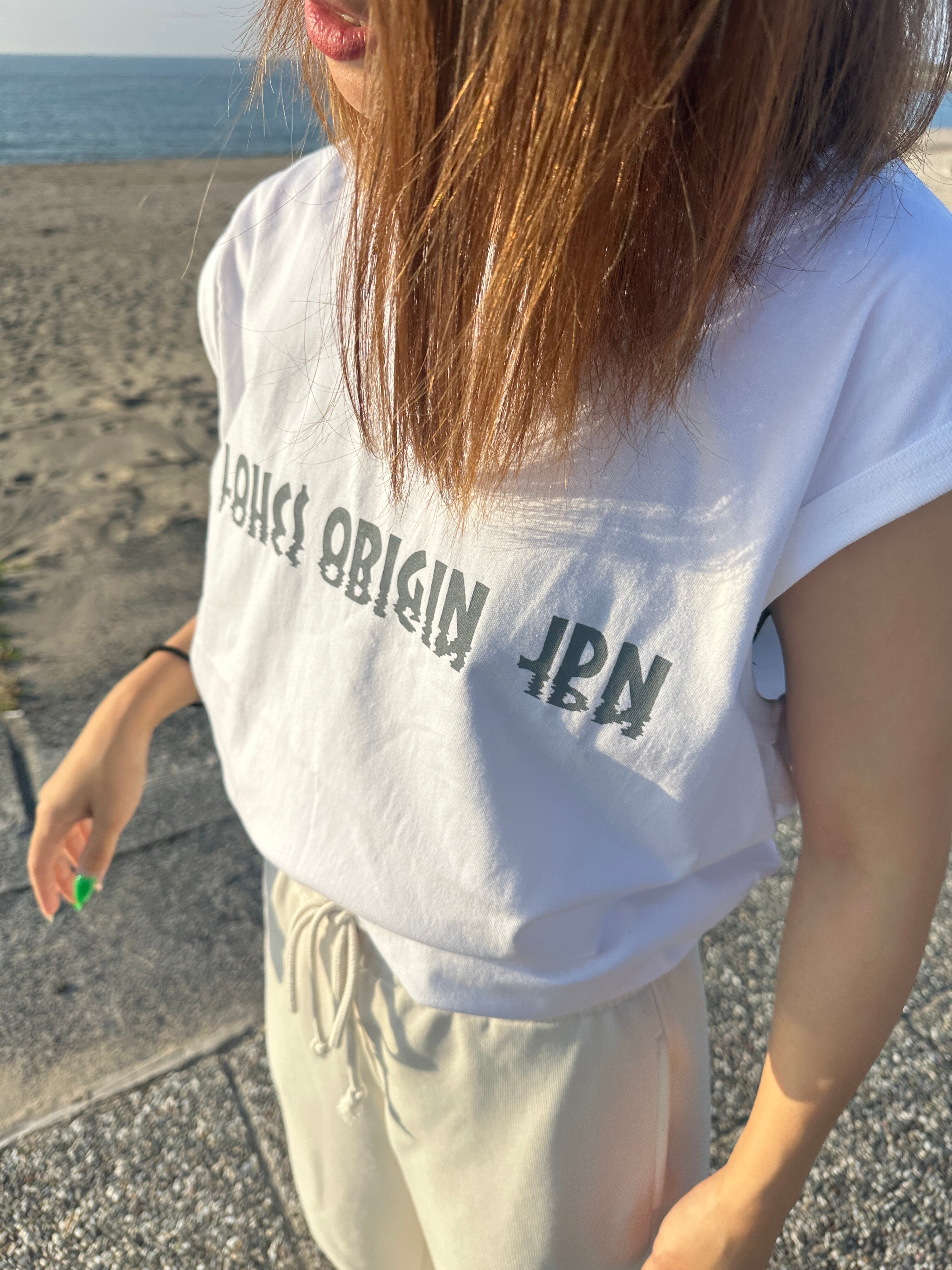 胸のセンターにLOUC$のロゴを波や水面の揺らぎを反映したフローティングテキストデザイン